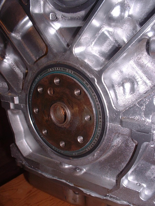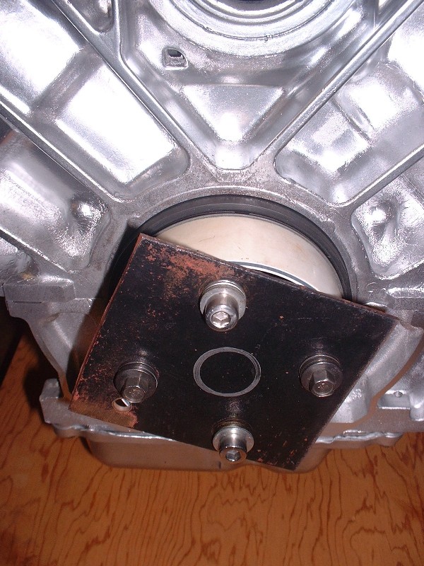 Then, by using the metal plate on top of the pipe, along with an assortment of bolts and washers, the sleeve and seal assembly can be pressed onto the end of the crankshaft squarely and under control by tightening the four bolts. The instruction that comes with the seal state that it must be installed dry, so don’t use lubricants here. You must be careful not to bottom out the bolts as you draw the seal into place because the holes in the crankshaft flange go completely through the flange. Immediately behind the crank flange is the rear bearing cap, so if you’re not careful and end up side loading the cap, you’ll warp it. To prevent this, I kept removing the bolts and adding more washers under the heads as the seal inched into place.