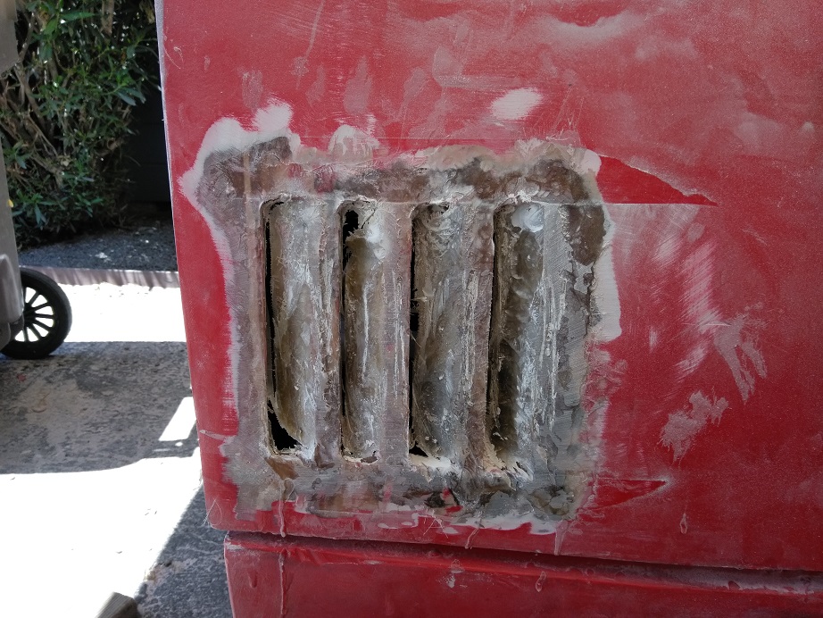 Heres some cheese Need to make the back rounded but theres a metal bar welded in and the trunks glassed to it. So I made a relief cut, propped it up, and threw some weight on top