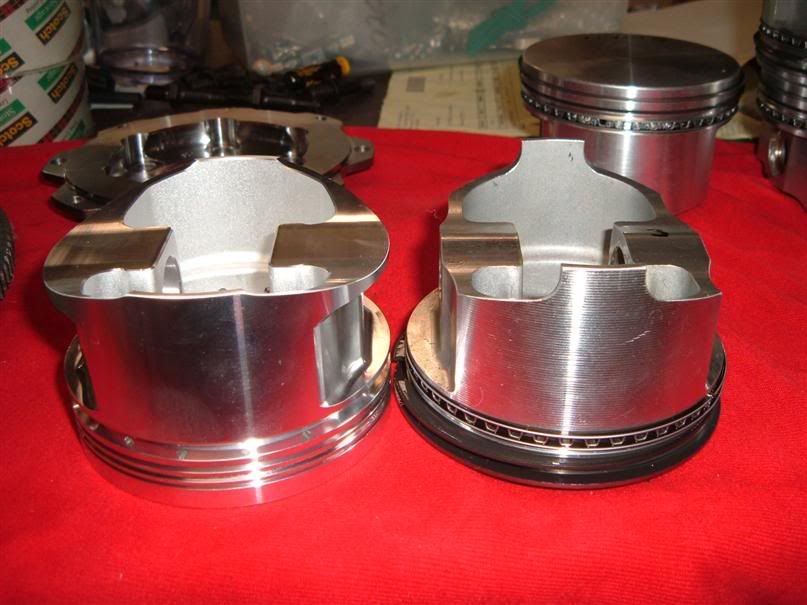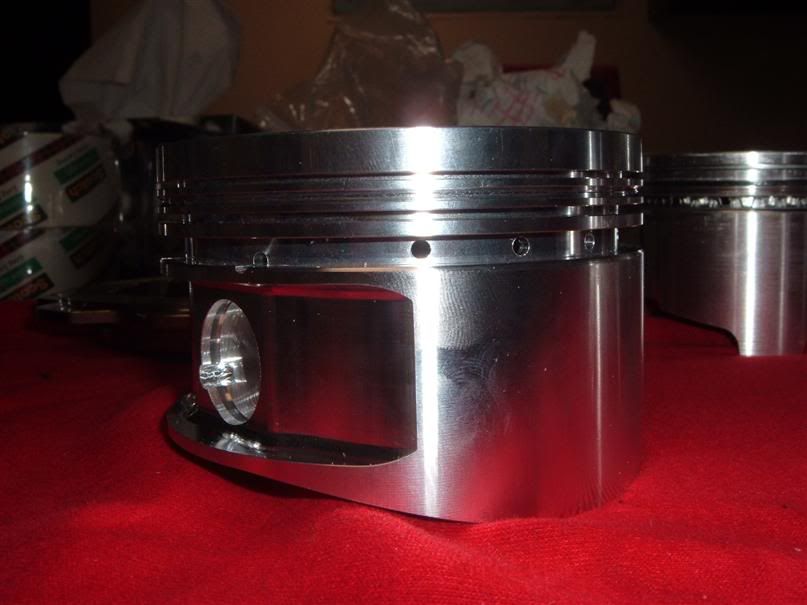 Well, I got my new pistons today and they look absolutely sweet, except that I wanted a deeper, lower diameter recess cut instead of the way they did it. So any quench I was looking to gain with these pistons was probably eliminated.  Sigh... My mistake, however, as I didn't specify that I wanted an inverted-D cut before the shop ordered them. Oh well, I've reached the end of the road as far as pistons go, and these look to be very nice pieces that will take whatever I throw at them. I'm somewhat disapointed, but at $700, I feel it is unnecessary to go through this again. Granted, it wouldn't be quite that much, since I got pins and rings as well, but hey, I've still got other stuff to pay for. Anyway, I just had an absolutely fantastic chat with bryson's (turbo Q4) dad, who informed me that my head and valves are coated and ready to ship. Thanks for the call, and most definitely call again, I'd love to talk about engine management for your project. So, what this means is that my build is now down to the clutch situation, getting the pistons installed, getting pushrods of the correct length, and exhaust/intake work. I can't believe I'm on the home stretch already. Anyway, updates about critical (read: expensive) items may be few and far between from here out, as I'm going back to school tomorrow, but I'm always working on something and will keep this thread updated with respect to that.