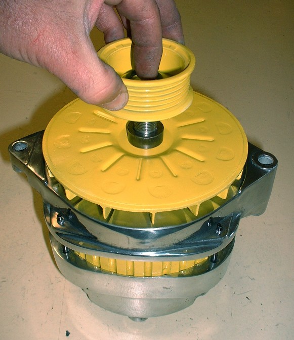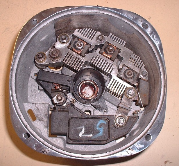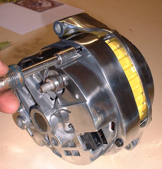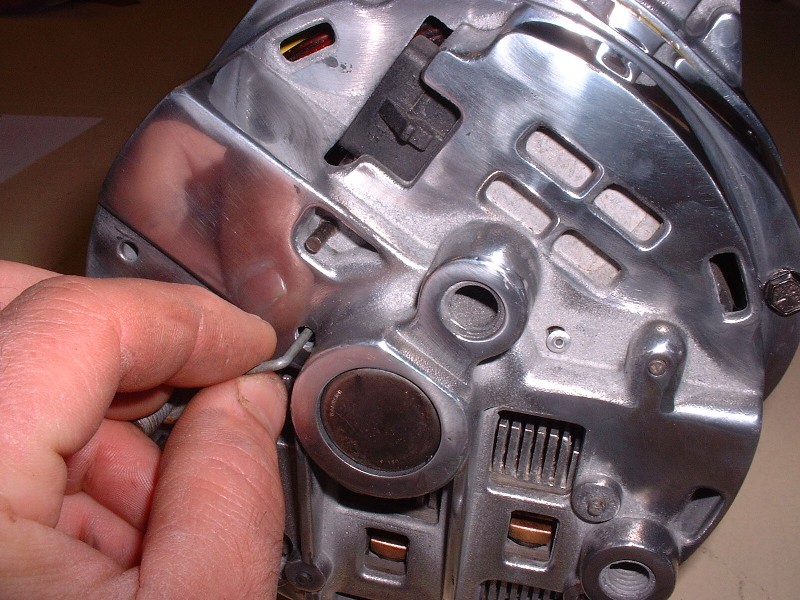 With the two halves back together again, it’s time to pull the pin out of the back of the alternator to release the brushes, like so: