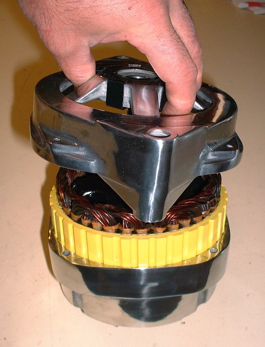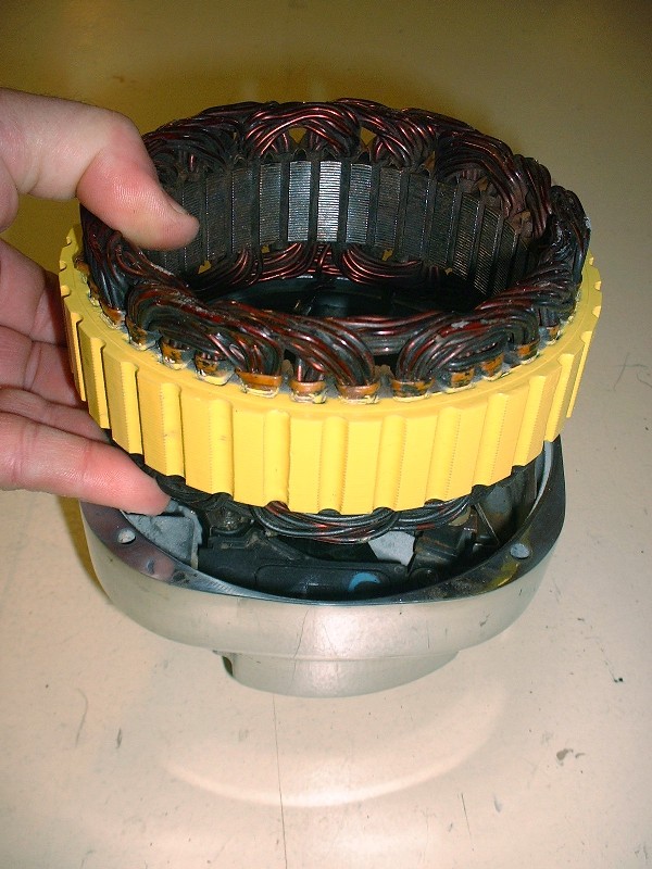 Here are the field windings being installed. Not visible in this photo are the three wires with eyelets on them that attach to the three studs mentioned above. The windings themselves are countersunk into the rear housing by about 3/16”. Notice a trend in the color?
