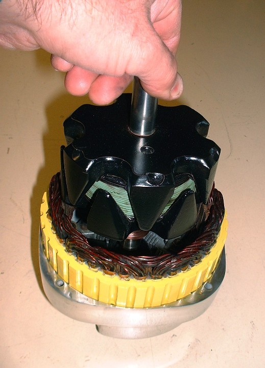 Once ready, it just gets lowered into place with the end of the shaft seating in the needle bearing that was installed earlier. At this stage, don’t forget to reinstall a thick spacer washer on the free-end of the rotor shaft. It serves as a thrust washer against the inside of the front housing.