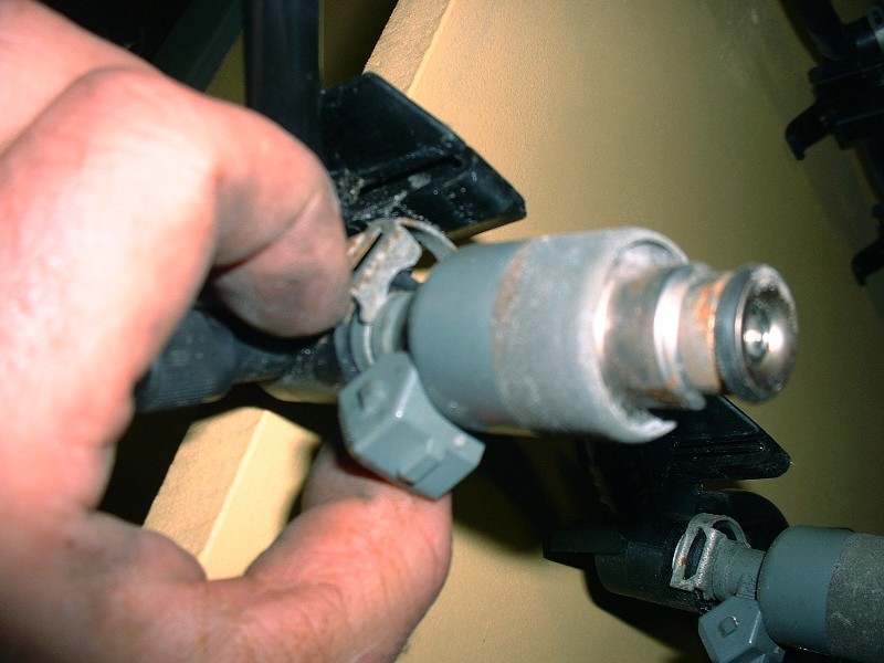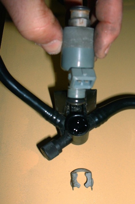 I haven’t decided yet whether to replace the injectors or try to get them cleaned. Where I live, I haven’t yet found a shop that can clean them unless they’re installed in the car, which makes the whole process moot if I have to drive there first only to burn up a piston and some valves. I may have to break down and buy some new ones for peace of mind. PFF’er Will mentioned that there are inexpensive Ford pieces that are direct replacements. Regardless, here’s how you take them off the fuel rail… first, you have to pry off a stiff little metal clip at the top of each injector…