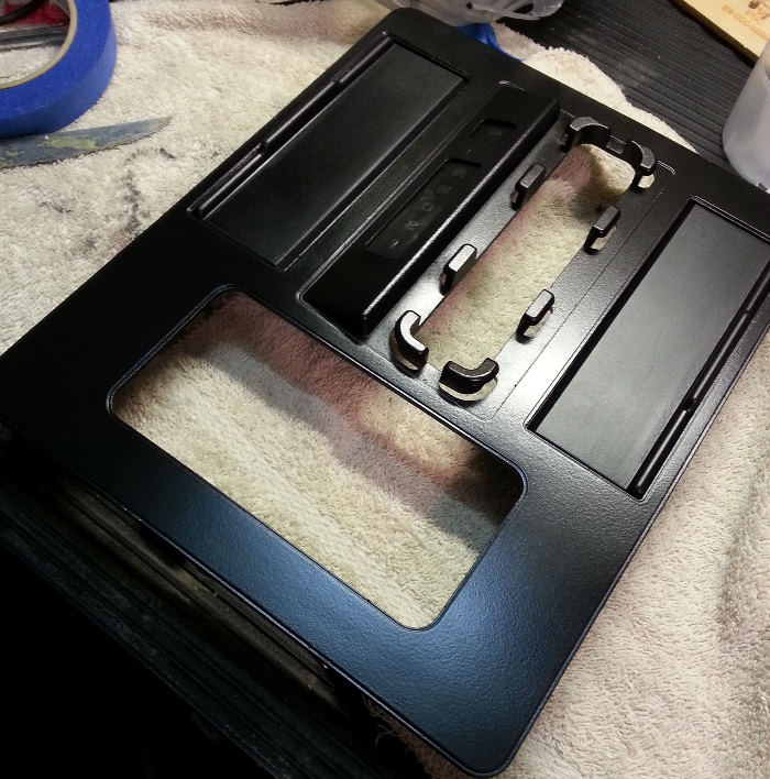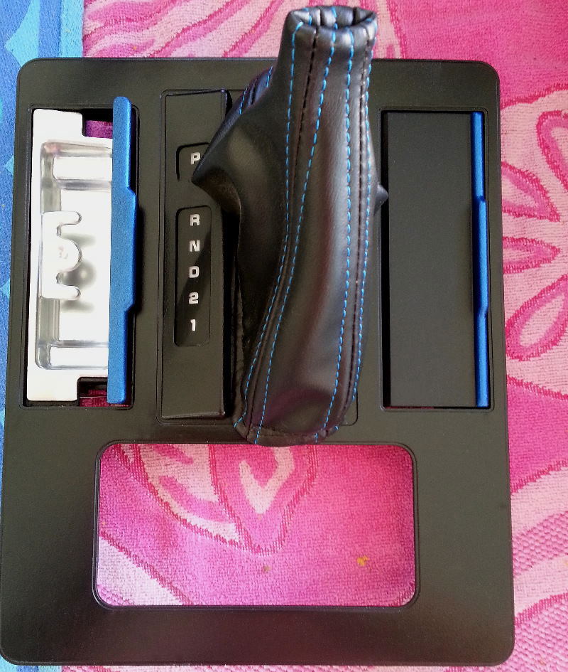 You know what might look good is a thin pin stripe of the blue around the outside edge of the shifter surround, kind of like the blue stitching is a thin line. leaving the rest of that area black. Just that little recessed outline edge maybe? Would kind of match the piping on your seats too.