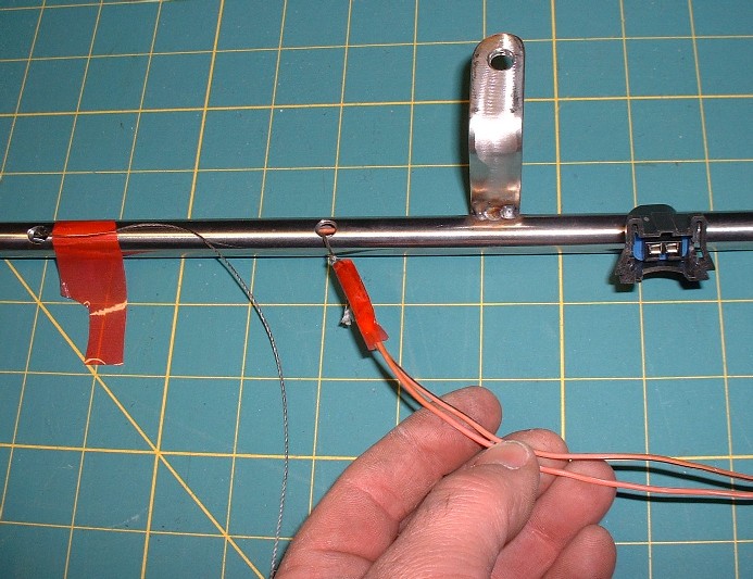 Here's a close up of how the wires and connectors protrude out of the tube. I'll still need to squeeze a dab of silicone sealant into each of the small holes to act as both a sealant and a grommet to protect from the steel edges.