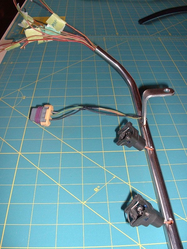 The hardest part was actually threading the wires for the injectors through the tube. At first I thought they'd all just slip inside and everything would be hunky-dorey. Not so. There's enough room inside the tube, but only just enough so the last four wires get really tight. Then I tried fisching them through with extra-tough strings like in the photo below, but there was no way to adequately fasten the end of each pair of injector wires to the string without the string pulling off towards the end. Lastly (and successfully), I threaded one sacrificial spare wire as a fische through each small hole until it emerged from the end of the tube, then soldered each pair of injector wires to it's respective fiche wire to hold it securely, and was finally able to pull each pair through... but not before a lot of silicone spray lube was used up and a lot of swear-words for the last three MAP sensor wires. I then tested each wire end-to-end for continuity just in case I broke any wires internally, and checked each wire to make sure it wasn't shorting to the tube either, but all was good.