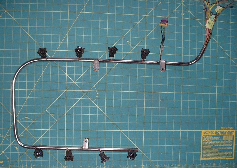 Here's how it mates up with the fuel rail to look like it's an integral part of the design. I opted to weld the little legs of the harness tube in such a way that they pick up different fasteners than the fuel rail does since to do otherwise, it would've been difficult to tighten the fuel rail fasteners with the harness tube in the way.