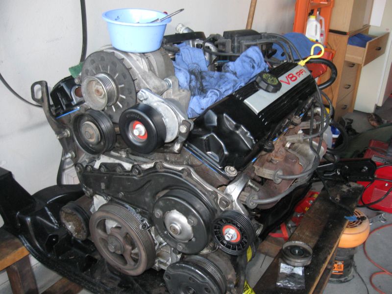 Sent the injectors off to Mr Injector for cleaning and service yesterday. I picked up another belt - ended up with the AZ 798K6. It was a tight fit but it does fit. I handed the boy a wire brush and instructed hm to clean all the rust off the pulleys. He was still out there in the garage at 11:00 last night. He got a wild hair and went to cleaning the motor. He did a great job of cleaning the motor and making a huge mess in the garage. I do not think the stains will ever come out of the concrete...... Gives me a good excuse to go buy that pressure washer I have been wanting.