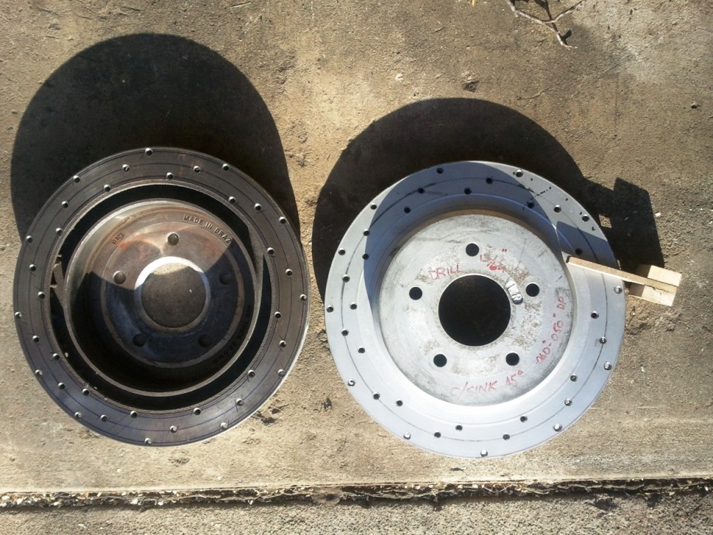 Rear rotors are cross drilled to match the fronts. I owe Grandpa a bottle of scotch for this as he made the jig and drilled them for me