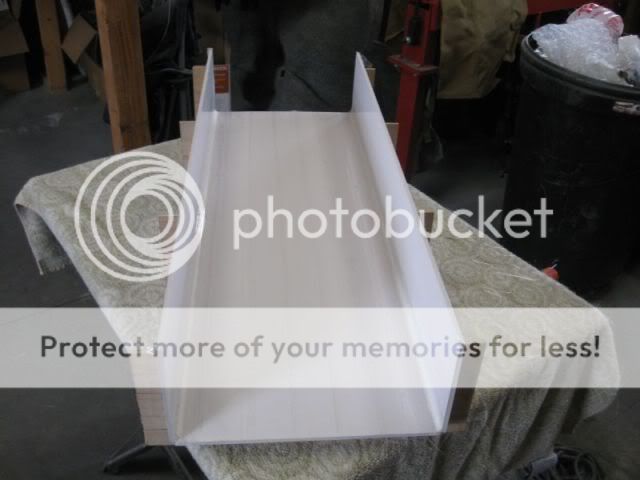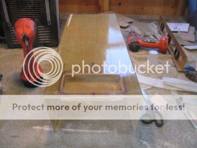After a brief intermission due to "work", I was able to get back to the console project yesterday afternoon. My plan is to build a new (different) shift cover. This one will be the entire length of the console in an atempt to give it a smooth flat look, My goal all along was to create a console that was smooth and seamless. I am getting closer to that goal. Yesterday, I managed to get the main part of the new cover glassed and started the test fitting last night. As I was test fitting, I noticed that there is an "elevation" change from the arm rest part of the console to the AC surround. I had 2 ideas to make up the difference. One was to cut a "wedge" on each side of the cover and then slope the cover from the high point on the arm rest to the AC surround and the other was to leave it flat and build a "spacer" at the AC surround to help steady the cover. I ended up leaving it flat and at the AC end and I built in a tray to hold things!