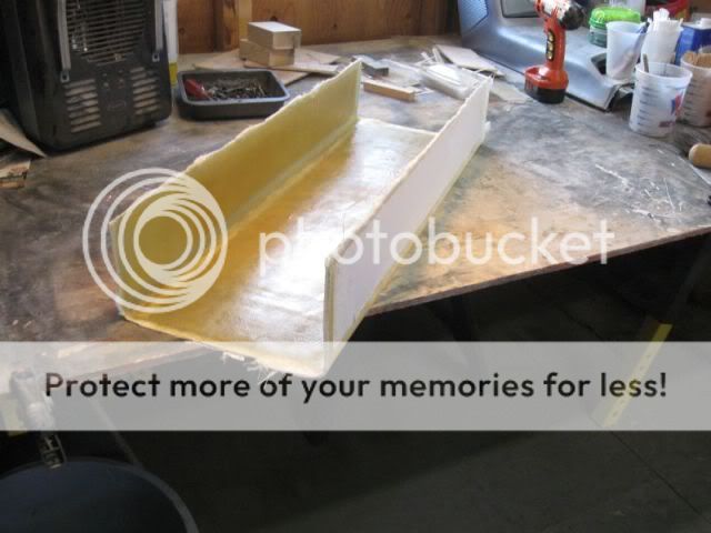Now here's where I messed up. I got in a rush when I was prepping the mold. I used some epoxy to "round" the corners in the mold. The epoxy I used was old and had been sitting in my shop on the shelf for about 4 years. It was not setting and was still kind of soft. I tried to scrape it off but it was tearing the paper from the foam core. So I decided to just cover over the top with packing tape. I was in such a rush to get the glass work started, I failed to wax the side walls of the mold. Once the glass was cured, I peeled the mold off. Unfortunately, the paper came off with the part. So now I have a lot more sanding to do to get the paper off the mold. I tried a small area with my sander and 50 grit and it just balled up and plugged up he sand paper. I may have to lay another layer of mat over top to cover the paper. Just makes a lot more work but I learned a vaulable lesson. Prep, prep, prep........