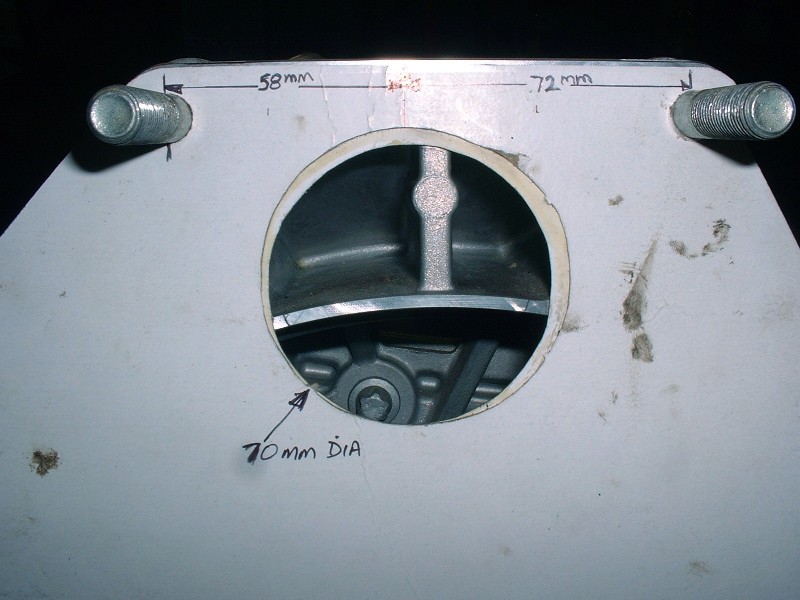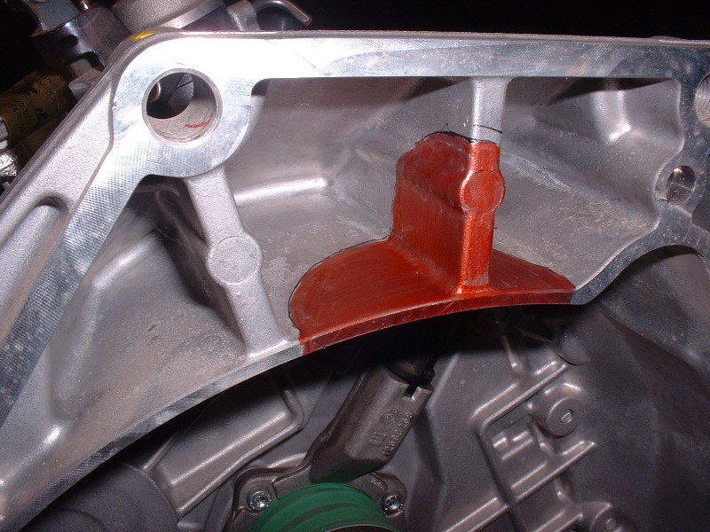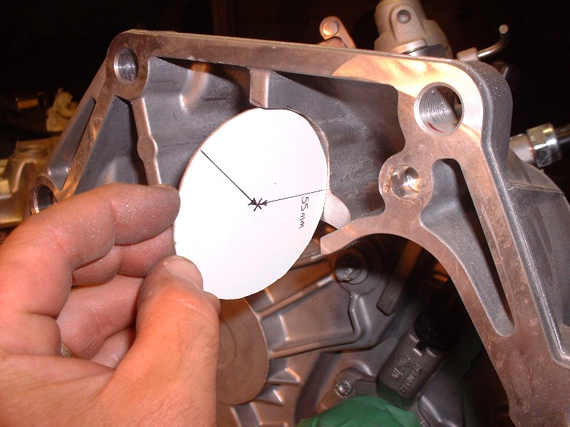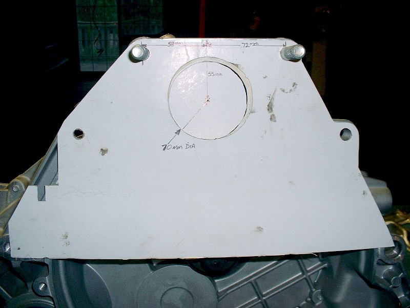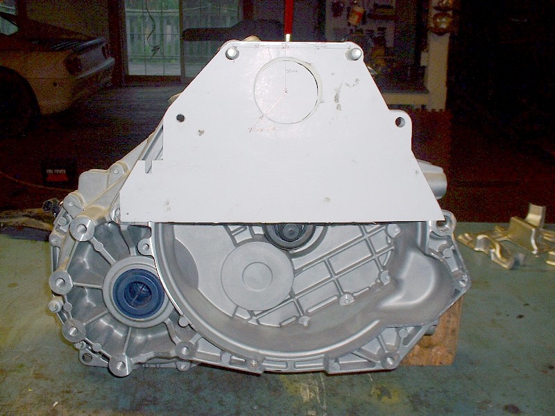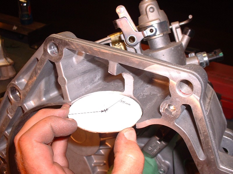 Here are the critical dimensions for anyone doing this in the future. Basically locate the center of starter hole 58mm to the right of the top left bolt as viewed from the bellhousing side of the transmission. Then, drop 55mm down at 90* from the top edge of the bellhousing to locate the center of the starter. Use that point to draw a 70mm diameter circle (35mm radius), which is just large enough to clear the diameter of the starter snout.