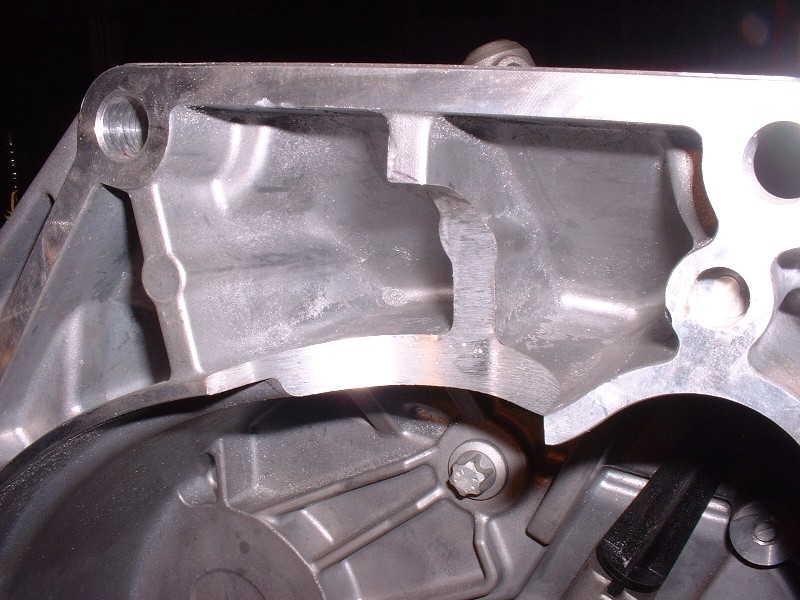 Here’s a close up of the area on the transmission where the triangular notch was cut out to clear the water log. I purposefully made it as tight as possible to avoid the appearance of an aftermarket mod.