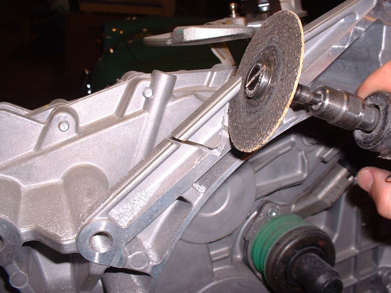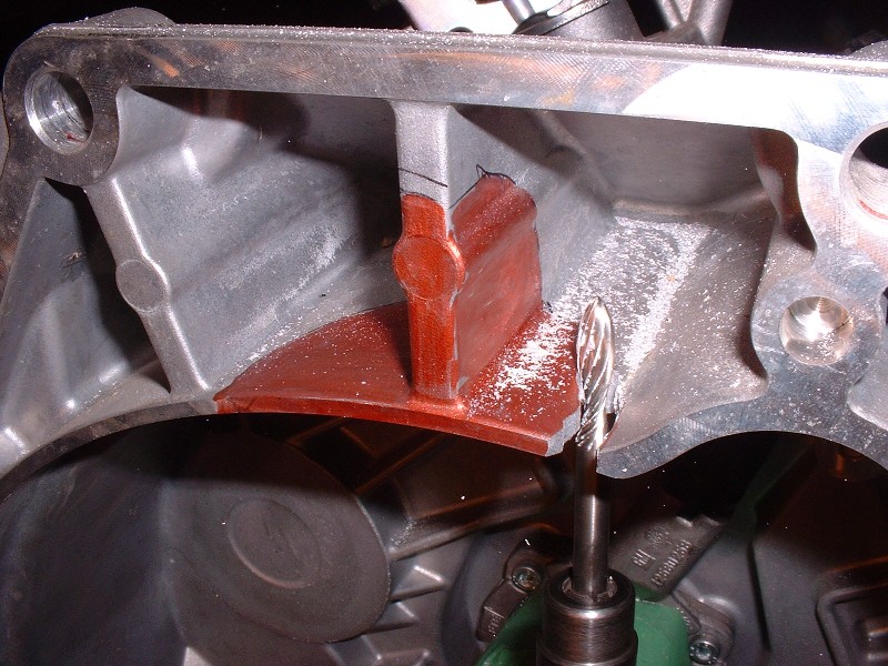 Next on the “to-do” list was to cut the triangular wedge out of the bellhousing to clear the water manifold at the back of the engine. I simply traced the outline from the template I made earlier onto the bellhousing. Then, to make a nicer radius at the corner where the two cuts meet, I first drilled a hole. I used a cutoff wheel on my die grinder to make the cuts and it went fairly well: