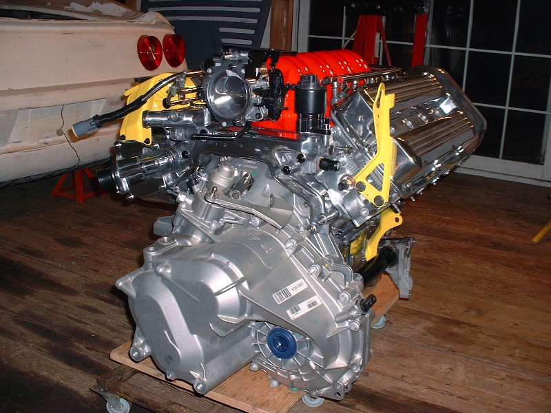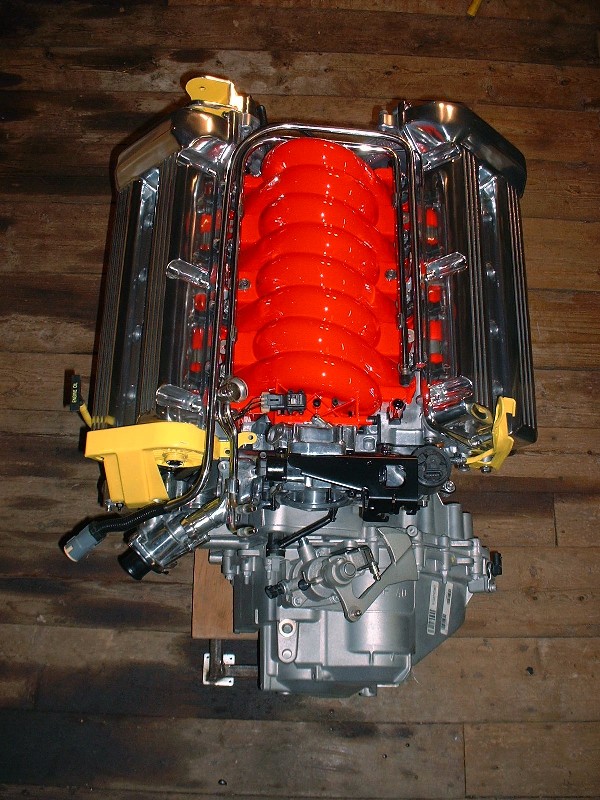 And a top view. It’s amazing how much of the transmission disappears under the water manifold before finally mating up with the bellhousing face of the block. My next big decision is what to do to refinish the transmission. I’m not polishing it, that’s for sure, and I don’t feel like taking it apart to have it powder coated, so painting it to keep it looking fresh might be the solution… but I’m undecided.