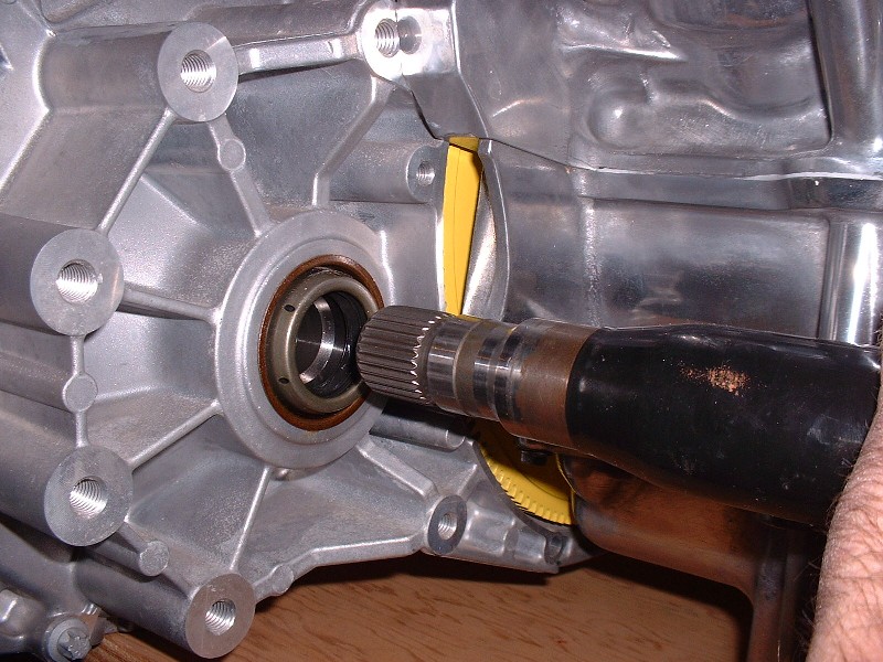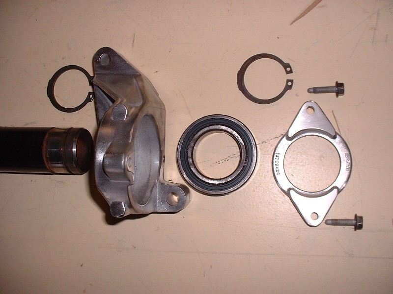 Here’s the 2007 Saturn Ion jackshaft cleaned up and disassembled. It’s really quite easy to take apart, all you need is a pair of good snap ring pliers and an arbor press to get the bearing out of the carrier, and the bearing off the axle. The bearing is located in the housing on the left hand side of the picture by an integral backstop machined into the housing. To keep the bearing from walking out of the housing on the right side, there’s a ring (the piece to the extreme right of the picutre) that bolts to the housing and sandwiches the bearing against the backstop. (Notice these are SAAB parts!)