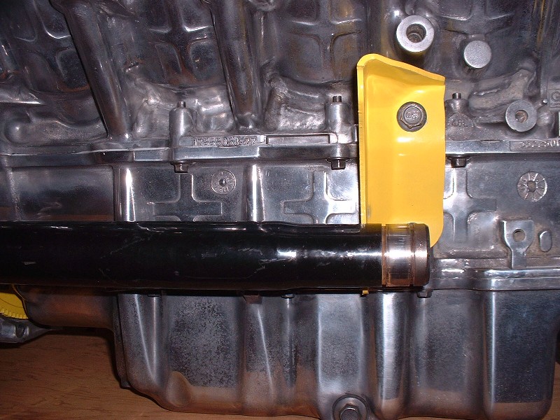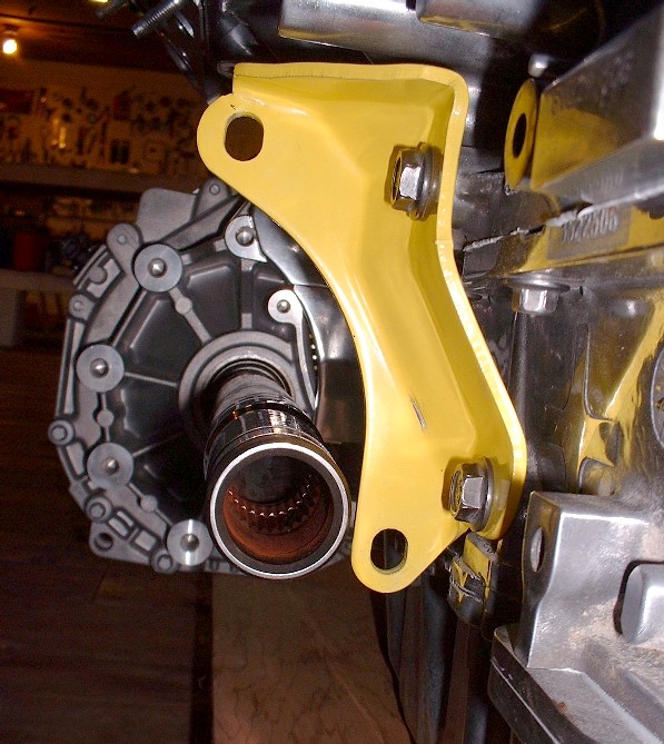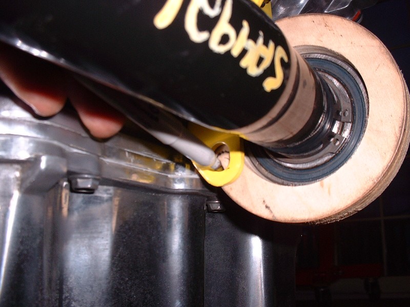 Once the jig was securely butted up against the yellow bracket, I double checked that the jackshaft was also inserted the proper depth into the transmission. To do this, I simply made sure the mark on the shaft from the original car's output seal was more or less in line with the F40's output seal. Then, I traced the location of the lower hole onto the jig from the back side of the yellow bracket.