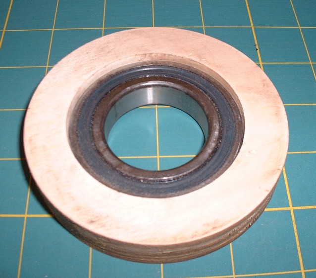 The next challenge was to find a way to measure the distance from the holes in the yellow bracket to the centerline of the of the axle in free space. After some thought, I fabricated a preliminary jig out of ¾” plywood that would hold the bearing and that I could then install on the axle. I cut the wooden jig to a 4-1/8” outside diameter because I happened to have a hole saw that big and because it left enough material to be able to pick up the lower hole on the yellow bracket, and still clear the block. It could have been any shape but the hole saw was handy.