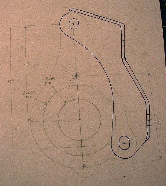 This then gave me a fairly precise ability to measure where the mounting hole was in relation to the center of the axle, and it allowed me to make a few measurements to determine how thick the final housing would have to be to reach the bracket on the inboard side, and yet still locate the bearing in the correct axial position on the jackshaft. With that information, I was able to work up a shape for a new bearing housing that would mate to the OEM transmission bracket. Here is the preliminary drawing I made.