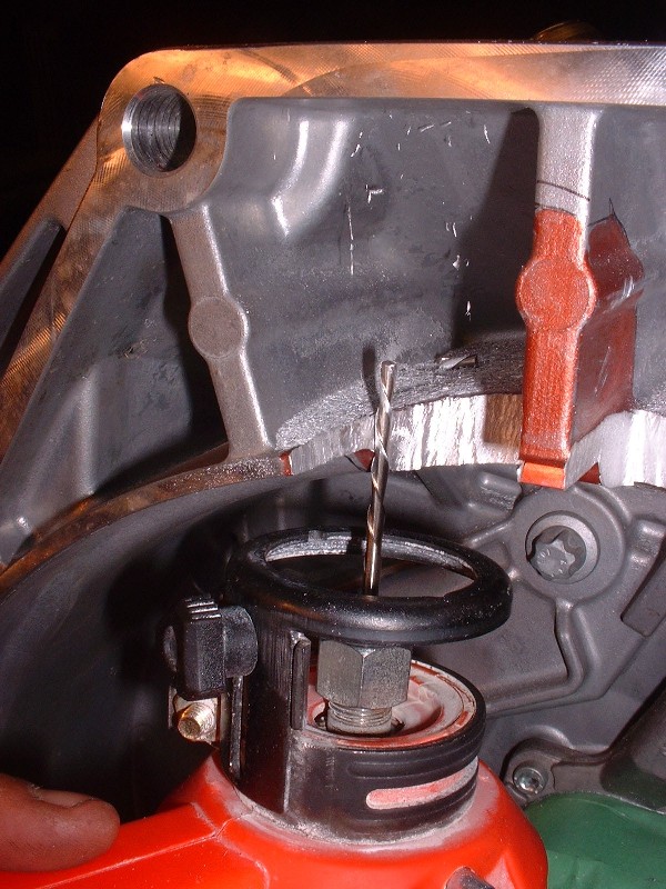 Use an exacto knife or something similar to cut out the hole since you’ll need to keep the circle for later. Next, test fit the template on the engine to be sure the starter hole is properly located. Once satisfied I had the hole in the right place (if you look carefully, it took me two tries!), I relocated the template back on the transmission using the two top bolts, and colored the edges of the webs that I could see through the starter hole using a red marker. Notice that the hole isn’t centered on the vertical web of the transmission.