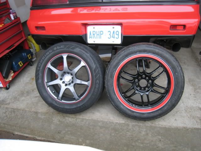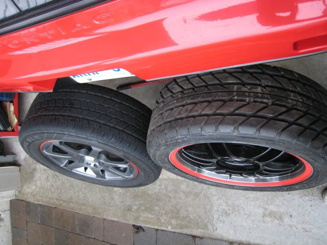 I wanted to test fit the wheel that I applied the red lip to. You can see the new wheels vs the old ones here, and you can see the much, much better tires I will be using. This time around, I went with a 235 in the rear, 225 up front, and the rear overall tire height is slightly larger. The old rims were 16 inch, the new ones are 17's.