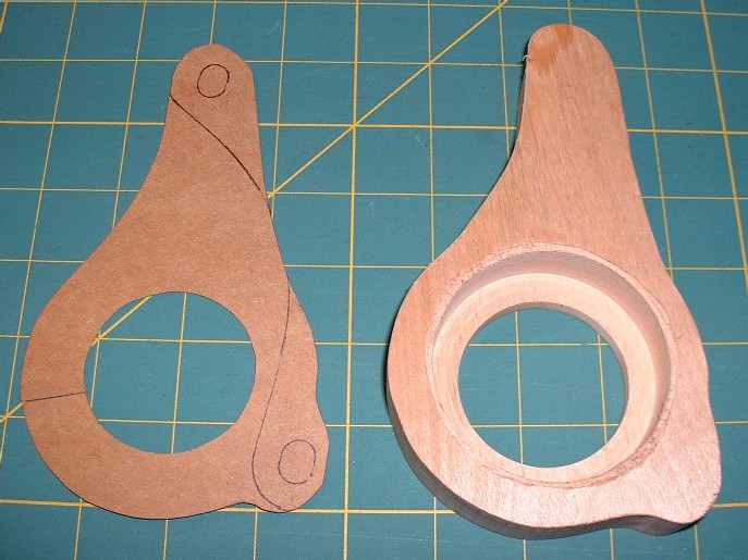 Anyways, I’ve got more pictures to share so here we go: Once I had drawn out the shape of the jackshaft bearing mount, I wanted to make one out of some scrap hardwood I had lying around to confirm the dimensions were accurate. I cut out the cardboard version and used it to trace the pattern on a 1” thick piece of wood. Then I used a pair of Forstner drill bits to cut the bearing recesses, and a band saw to cut the outside shape.