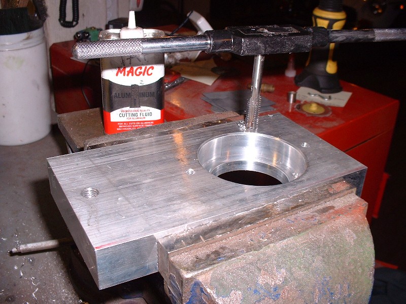 Then I tapped the two sets of holes for metric threads since everything else on the engine and car would be metric. I tapped the mounting holes for M10 X 1.5 and the little bearing retainer holes for M6 X 1.0 if I recall correctly. I almost ran out of length for the smaller tap while trying to cut the threads all the way through the 1” material.