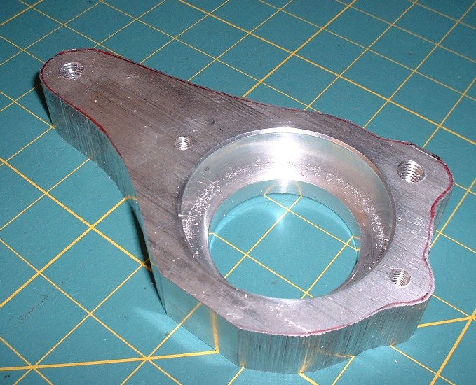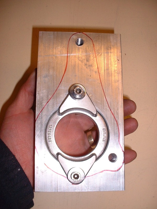 Once that was done, I transferred the final outline of the bearing mount onto the block of aluminum and test fit the bearing retainer just to make a prettier picture.