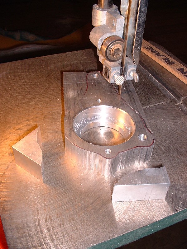 Then it was time for this thing to shed some weight! Unlike some of the richer people here on PFF with multi-axis computer numerically controlled milling machines, I had to resort to using my trusty-dusty band saw to make quick work out of getting the rough shape to come out. My machine shop asked how many I was going to make and offered to enter the design in Solidworks for a nominal fee, but I couldn't see a big market for it and besides, I wanted it, like now. As I cut through the solid block of aluminum, I started to feel a little like Michelangelo probably did as he was carving the statue of David out of marble, except I was probably more excited.