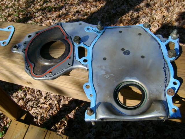 I laid the gaskets out so they can flatten out. The timing cover plate to block gasket looks like it will go on either way, but try it both ways before you do the install as one way is incorrect, and will cause a big time oil leak. Look where the squiggly line is on the right side. The gasket is curved there, and straight on the opposite side. I marked the gasket 'block' on the surface that meets the block. Once I get this gasket on the engine I will add some RTV. I want to get this all installed and tightened down good before the RTV starts to set up.