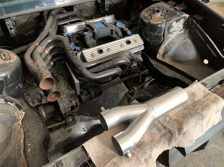 Hey there Will... I did actually consider using an X-pipe early on mainly just for the sound, but there really wasn't enough room after the collectors to effectively use one. I decided to run a Y-pipe for a few reasons, limited space was a big one. Dumping both exhaust collectors into one pipe looked like the best option for how I wanted to route the exhaust as a single center-exit system through the back.