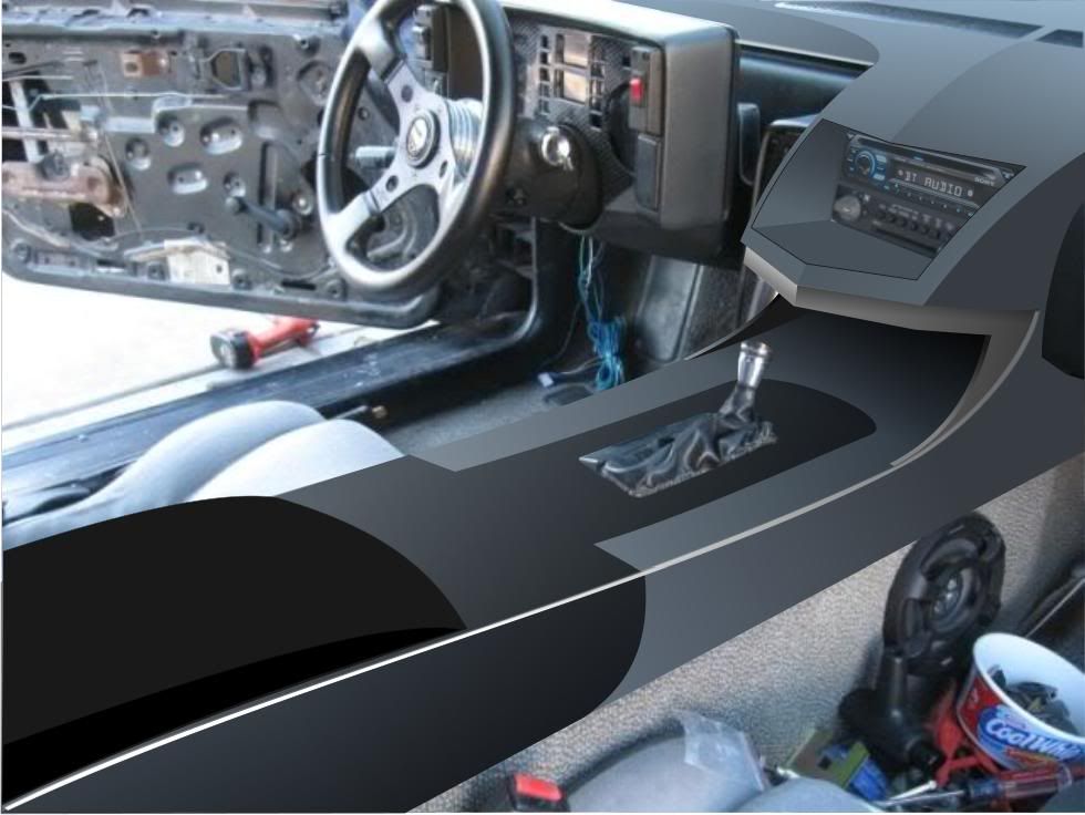 I think I like this one the best as it reminds me of the Fiero... If it were me, I would make the radio opening double-din... I would also make the center arm rest padded and hinged open (hinge along the passenders side or back) for extra storage... Duno if it would be possible to do this, but a slide-out cup holder on the pass. side of the shift console (the part you have in white in the above pic). This way, it would be out of the way of your arm/elbow while shifting...