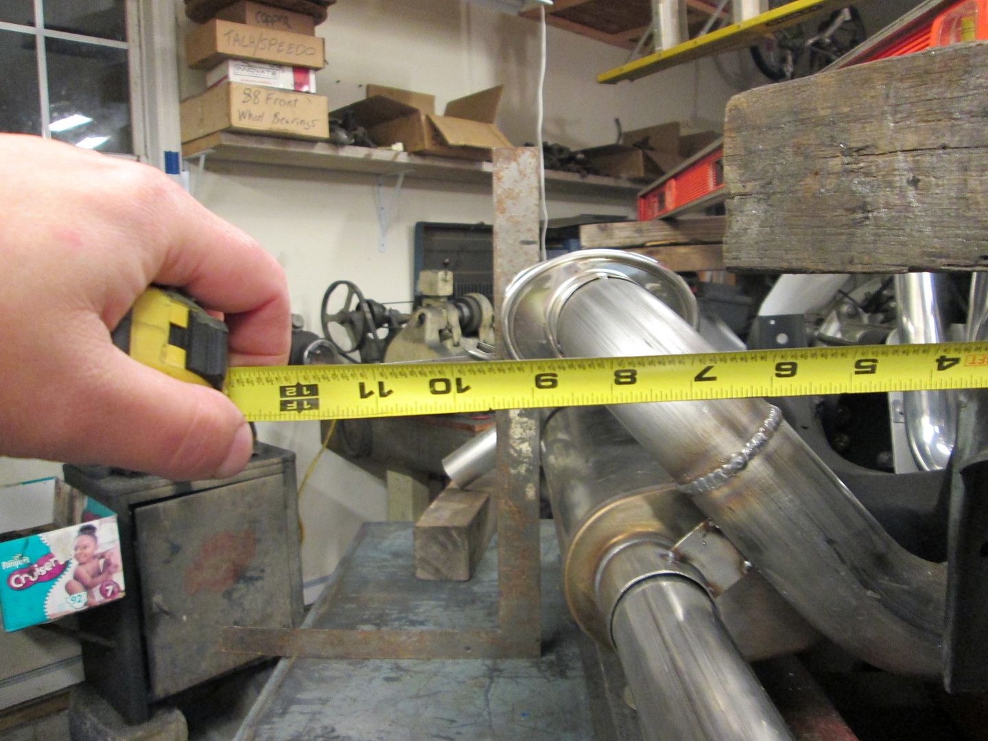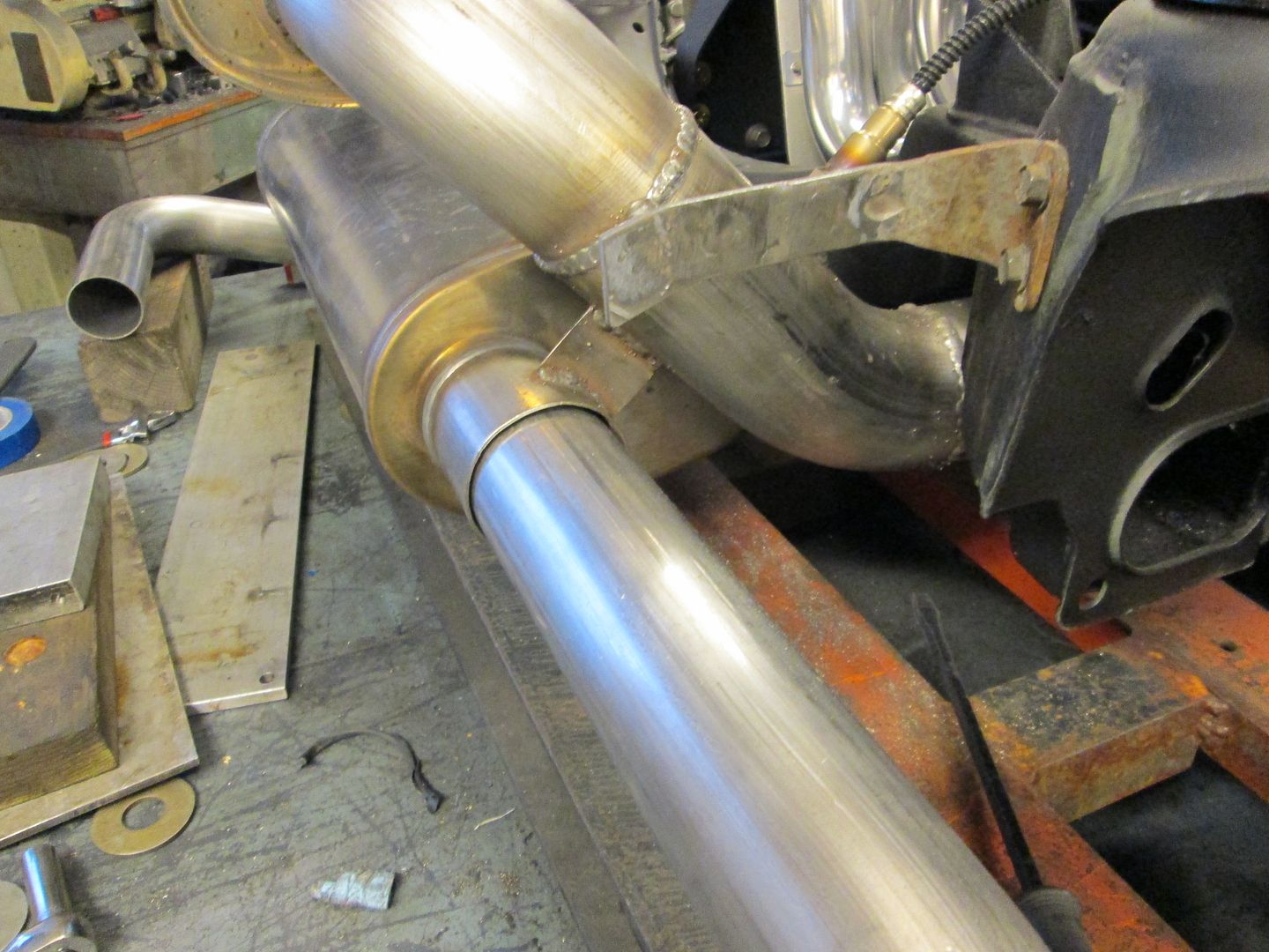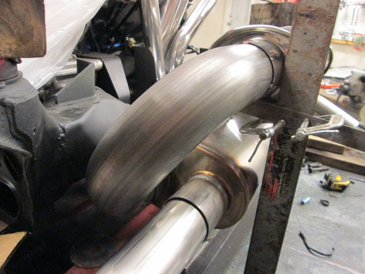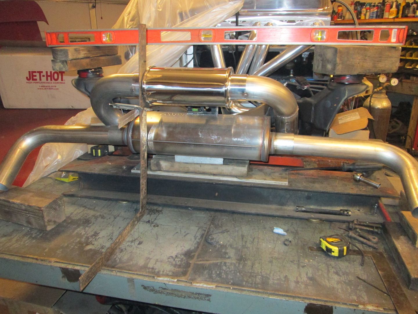 Its almost time to put the drivetrain back into the engine bay. I finished welding up the exhaust except for the 2 1/2" pipes that go to the tips - I need it in the chassis to center and level the pipes to the body: