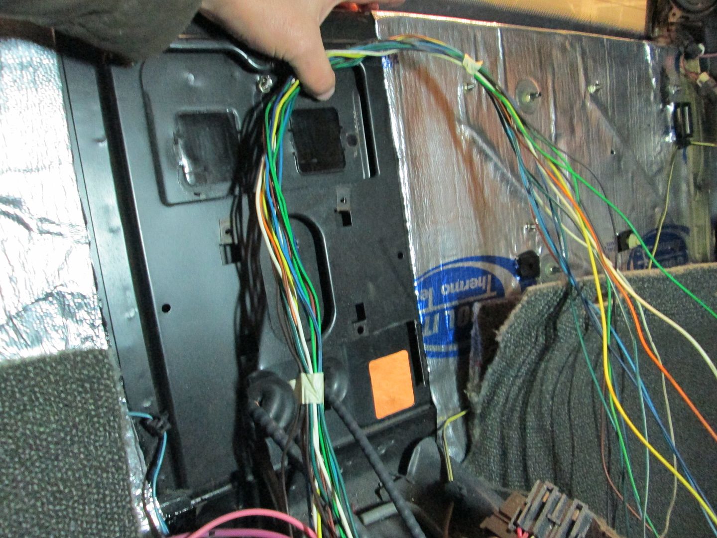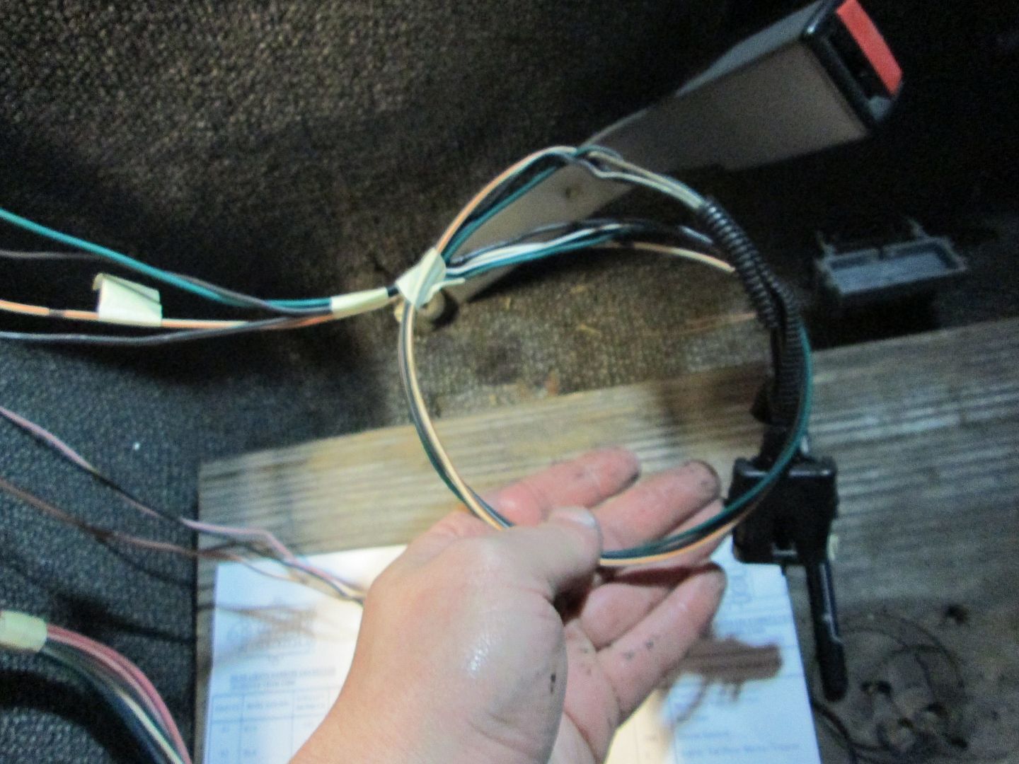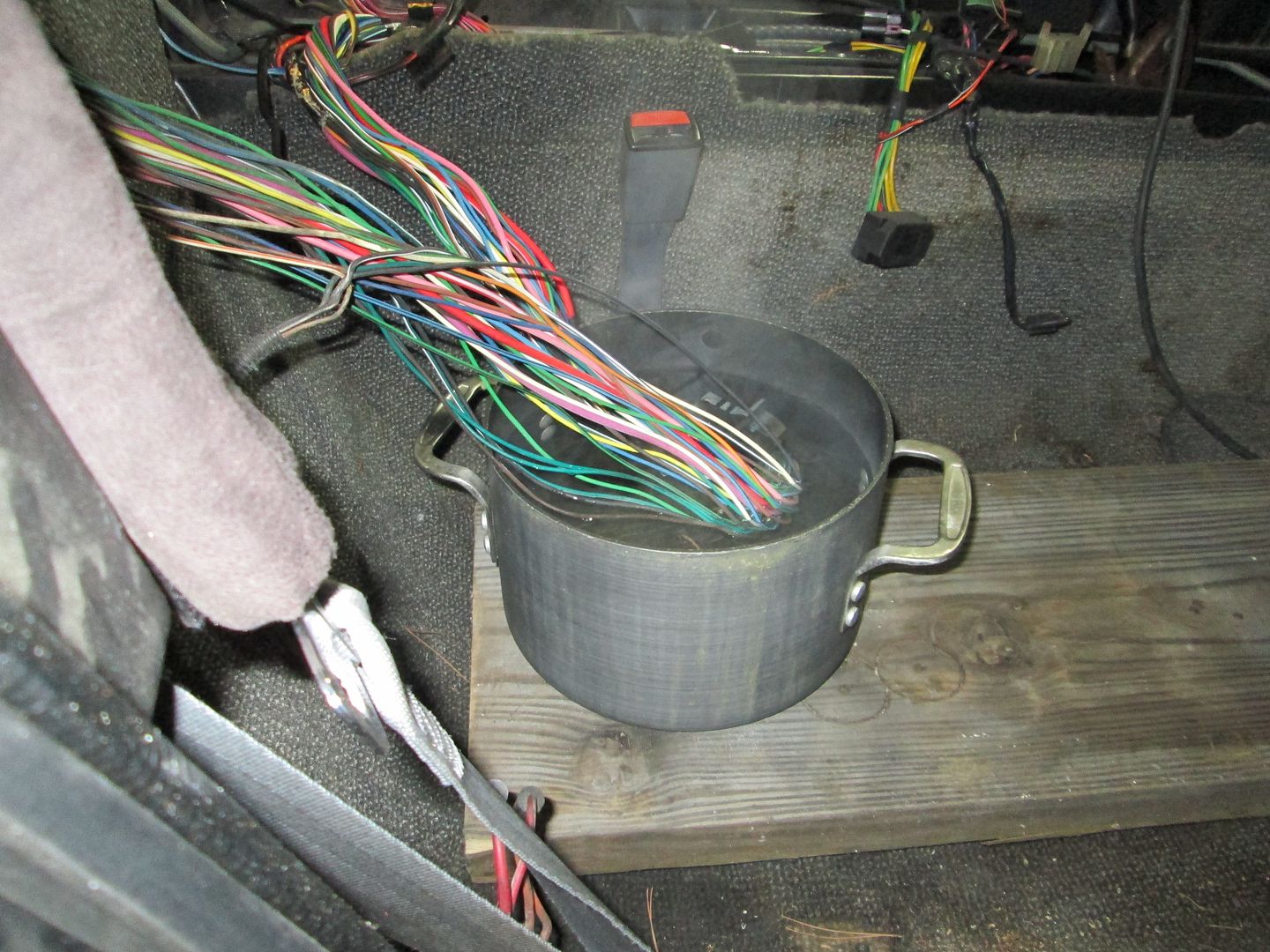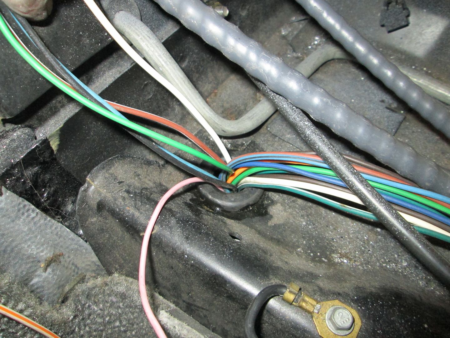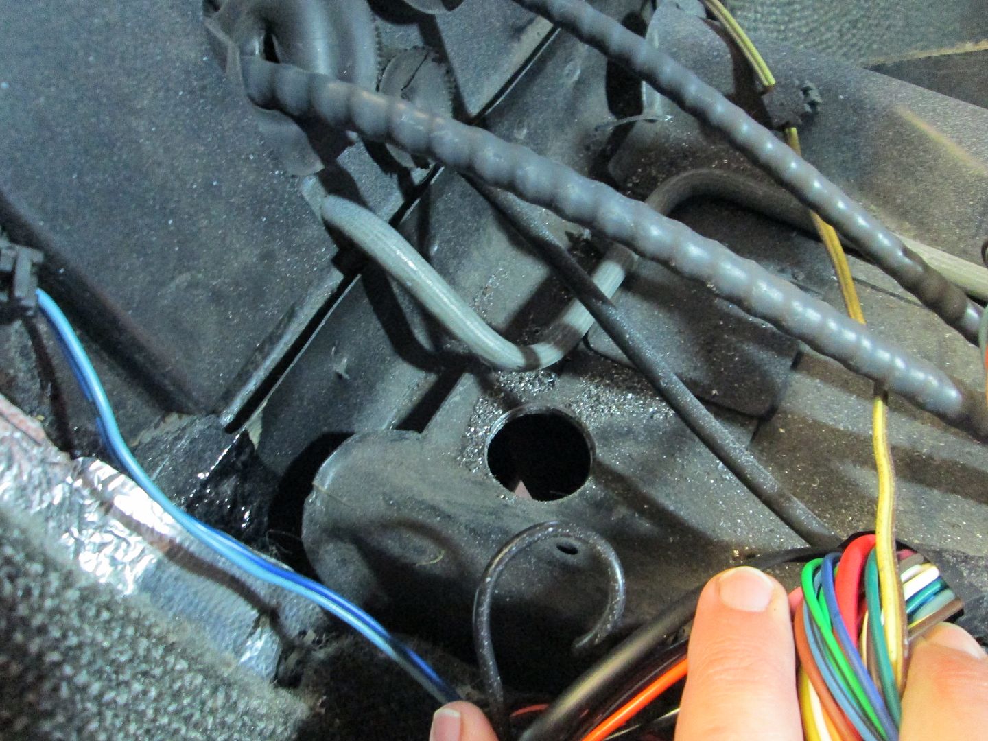 Drilled the access hole in the center console as well as in the side of the chassis to access the double firewall section. De-pinned the fuel pump connector and the trunk release connector so I could pass the wires through the holes, then reinstalled the connector pins. Passed the rear harness (including the 2 wires for the water pump) down into the fuel tank area, then installed 2 layers of heat shrink to protect the wires. Snaked a piece of rod through the double firewall section, tapped the harness to it and pulled it through. Once that was done I was able to reconnect the two sections of wired with western union splices, soldered, heat shrinked over the splice, then heat shrink over the entire spliced area. When splicing the harness, I stagger the spliced every 3/4" so there won't be two splices right next to each other that could allow them to run through. It also keeps the harness from being bulky in the spliced area.