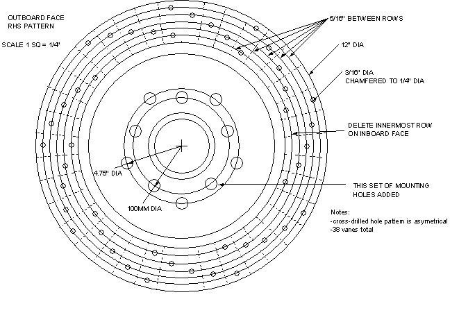 The first step was to figure out how the vanes were oriented between the inner and outer rotor faces since I didn’t want to drill into any of them. It turned out they ran radially outwards, not in a spiral like I had hoped. I prefer the look of spiraled holes as opposed to the one that run straight out from the center, but after pondering about it a little, I realized the vane orientation didn’t matter, so I created a little drawing and a template to guide me. (For those of you old enough to remember, I could probably have made use of my old Spirograph to create the template!)