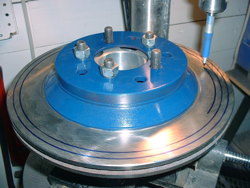 Then I set up the old bearing and spacer in the drill press. The bearing was useful since it turned the rotor into a handy-dandy turntable of sorts, while the 3" spacer kept the rotor from hitting the vise. Once my jig was lined up and leveled, I attached the rotor to the spacer with some lug nuts and was ready to start drawing out my concentric circles. I chucked a marker into the drill, set the correct radius up, lowered the drill just like needle on a vinyl record and spun the rotor. I made 5 concentric rings each 5/16” smaller in radius than the previous one by turning the adjuster cranks on the sliding vise.