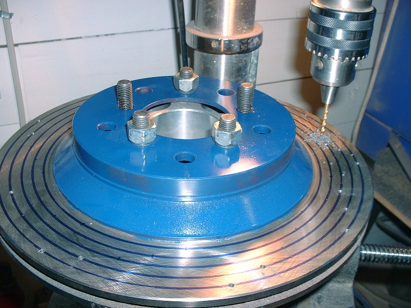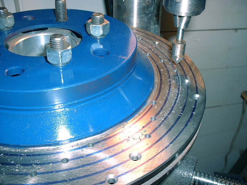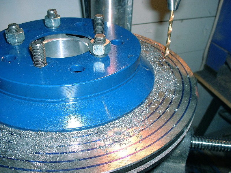 Here’s a completed rotor. I timed myself in case anyone else thought they might like to try doing this. It took me 2.5 hours to set up the jig and complete the first rotor, then each rotor after that took 1.5 hours. It makes for a long day at the drill press!