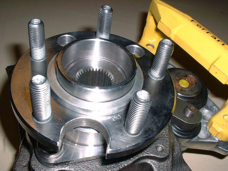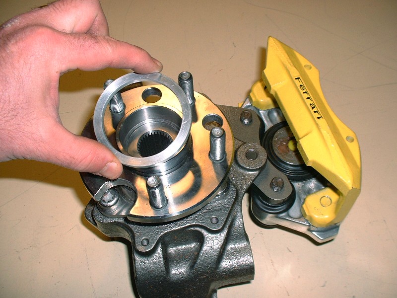 For the Corvette rotor to seat concentrically on the Fiero hub, most people know that you need an adapter ring to up-size the lip on the Fiero bearing flange. I got mine at the same time I got the caliper adapters from Fiero Addictions. To install them, it’s a simple matter of slipping it on to the snout and it’s done, but you have to be careful since there is a front and back side to the ring. The back side’s inside diameter is chamfered to accommodate the filet radius where the snout meets the flange.