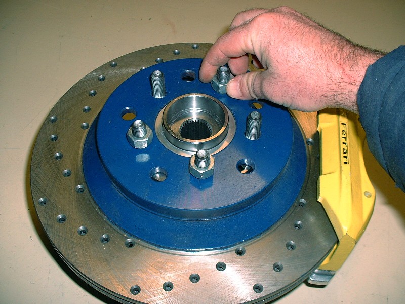 Then to secure it temporarily, I installed a couple lug nuts on a few wheel lugs. Here you can see how the hub centric ring takes up the space between the Fiero hub snout and the larger diameter center hole in the Corvette rotor.