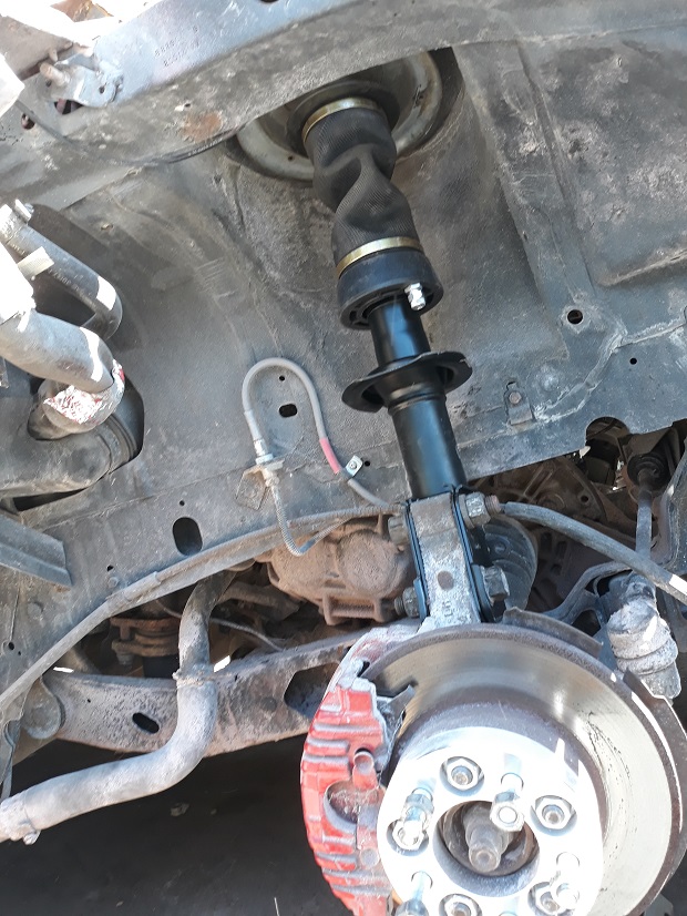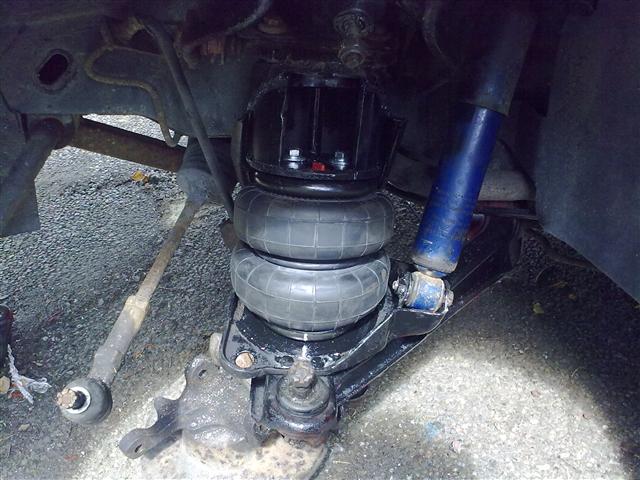 Fronts gonna be a biotch to get the bags in. The sway bars gotta go, its way in the way of the bag. Got the upper bump stop out easy w a big ol flathead and the 3lb sledge, hammered out the 5 welds in a few mins. Bags are fat, hitting something at all 4 corners. Top sides hit the spring perch, bottom hits the sway bar and the lower control arm spring plate side. Started opening up the perch and moved the sway bar as far forward as itll go.