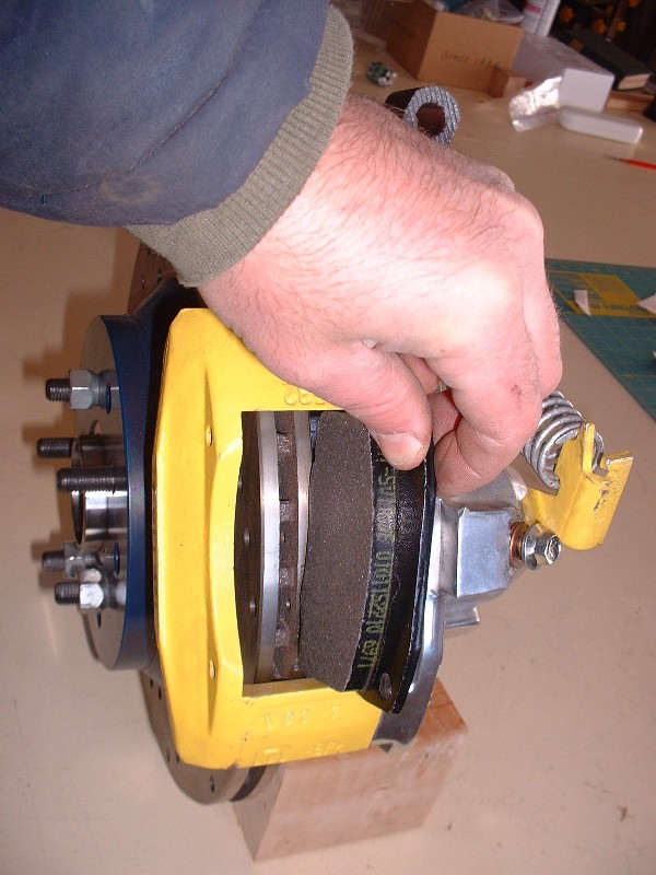 Well I’m running out of rear suspension build-up photos so this will be the last rear suspension post until these parts meet up with the new cradle. I left off the last time ready to install the brake pads so here’s a few pictures covering that aspect. The first one here shows that there are differences between the inboard and outboard pads. The pad on the left is the outboard one and is differentiated from the inboard pad by the lack of the two pegs in the middle of the steel facing seen on the right hand pad. These pegs fit into corresponding dimples in the face of the piston, so the piston must be rotated to have the dimples aligned vertically in order for the inner pad to fit.