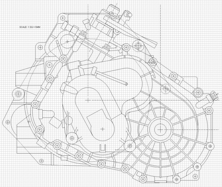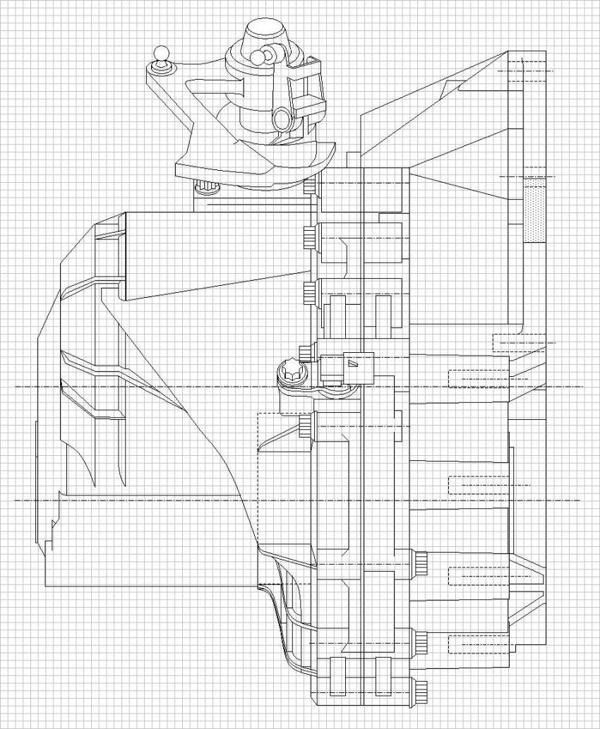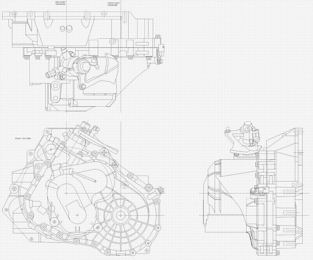 So here’s the fruit of far more hours of labor than I dare to admit. Each square represents 5mm. I’ll post high resolution drawings of the transmission when I’m finished working up the cradle drawings. It would be nice if Cliff could create a section on the forum for reference drawings like this. Currently I’m working up the rear knuckles, trailing and lateral links too. So here’s the three view… admittedly low rez to get PiP to accept it: