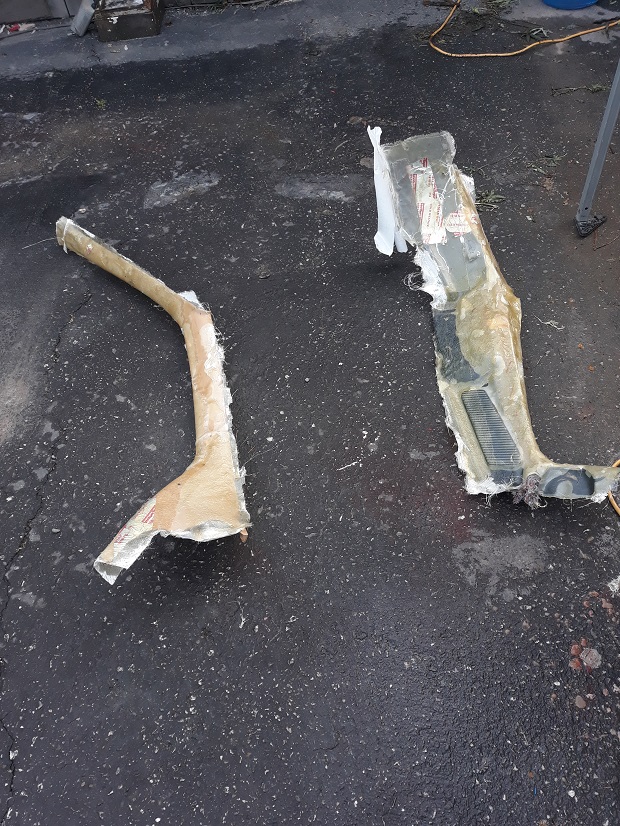 Well stuck on bags till I get more fittings. Got off my arse and broke out the fb. Glassed up the ds upper and rear chunks o trim. Bad pic, cars under the ez-up so it came out like chit