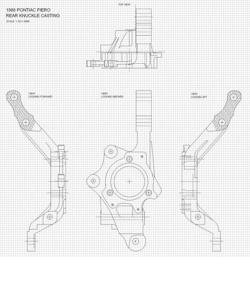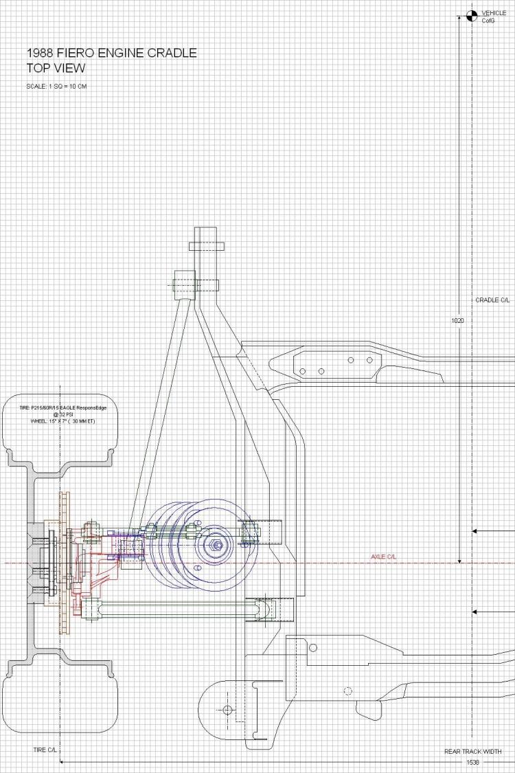 If you’ve been following along, I realized early on that to design a new cradle for the N*/F40 combination would be silly if I didn’t take advantage of the opportunity to study if improvements were possible as well. The problem with improvements is that you need to have a baseline from which to compare whether your modifications are indeed better or not. It sounds easy, but in reality, none of the Fiero engineering or technical data was released as far as I’m aware, so baseline geometry information remains a mystery to most of us. I hope to fill a little of that black hole by reverse engineering the drawings for the stock configuration as a starting point.