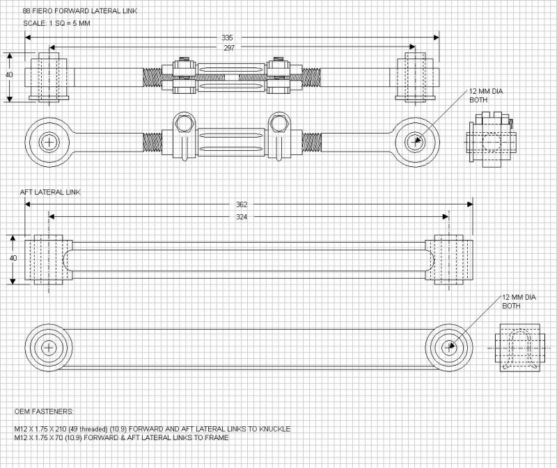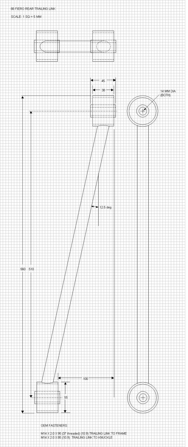 With these last parts drawn out, I combined all the previously drawn parts onto a single set of drawings depicting the rear suspension system in it's entirety. The precise location of the top of the rear strut wasn't an easy measurement to take, but I cross-referenced the dimensions from my own '88 project car chassis and those taken from an '88 GT stored here for the winter. Here are some sources of info regarding some of the dimensions: