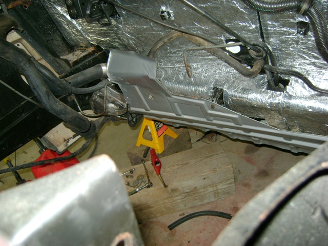 Now that I have my my transmission and the shifter working together I am finished with the shifter cable. I removed the ECM and its tray and installed the shift cable in the car. Replaced same. I patched over the open hole where the second of the stick shift cables went threw. I added the Fiero heat shield to the engine bay: