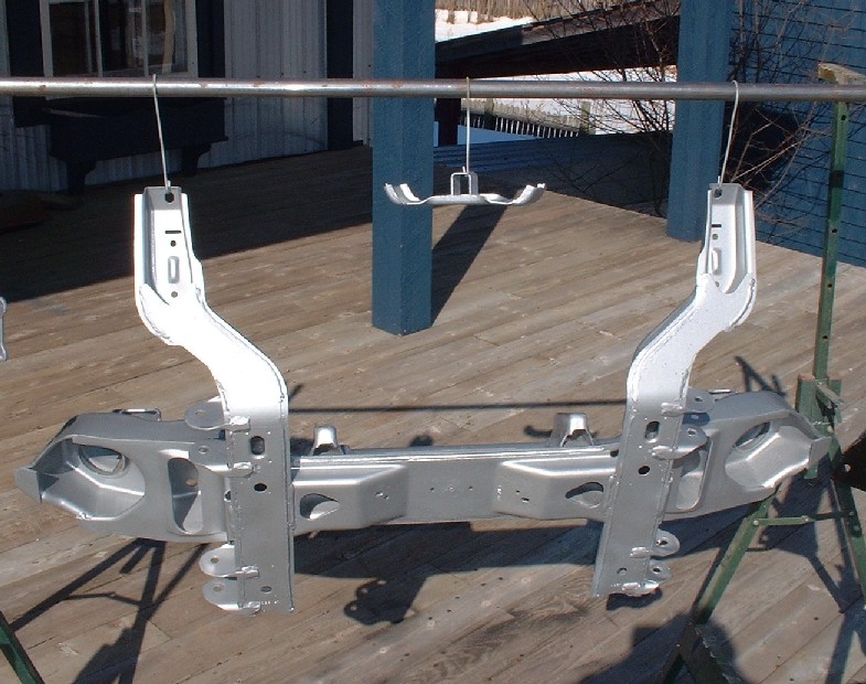 For now, it's back to the front suspension make-over. It’s amazing how a good sandblaster can take a painstaking, backbreaking, four-hour crappy task with a wire wheel on an angle grinder, and turn it into a joy to do. It took me less than half an hour and two $10 bags of crushed glass to strip the old paint and rust out of every pore, nook, and cranny of the front cross member. My compressor just can't handle the bigger jobs, so a friend of mine who owns a top-notch paint shop lets me do the big parts out-back at his shop where he’s got the right set up. Once stripped, I don’t like leaving parts sitting around too long so the shop primed it with an epoxy primer just as soon as it was done. A couple hours later it was home and painted in the final color.