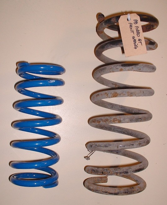 Next up is the installation of the shocks and springs. Here’s a close up of the my new 325 lb/in front springs vs the old OEM springs. I hope I didn’t make a mistake and order them too stiff. Only time will tell.