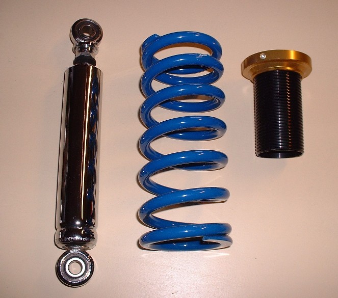 Here are the rest of the pieces that make up the coil-over shock. I got the Carerra chromed shocks with my suspension kit, not that anyone will see much of them once they get the adjustable tubes installed. The only thing missing from this photo is the upper spring seat. The springs are considerably smaller in diameter than the stock springs so HT Motorsports provide a heavy duty collar that serves as the new spring seat. I'll post a picture of them later.