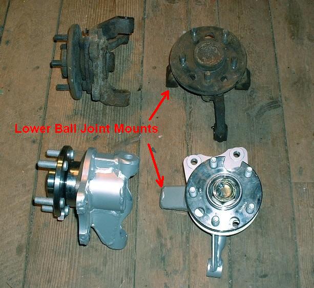 Finally, here’s what the spindle and bearings look like when assembled as compared to the OEM parts. The 1.5” drop is clearly obvious when you compare the two left-most knuckles in the photo. Notice how much more of the lower ball joint mount extends beyond the diameter of the wheel flange on the new knuckle as compared to the OEM one. (Well, actually, the ball joint mount is in the same location, it’s the spindle that’s been raised making the mount look longer.) That should take care of some of that ugly gap between the top of the tires and the wheel well lip.